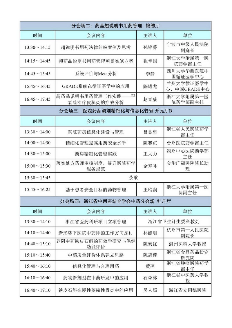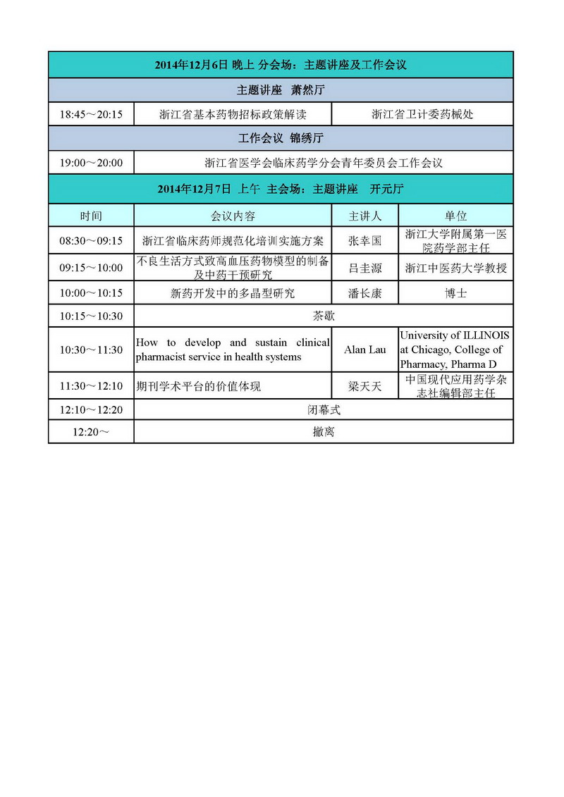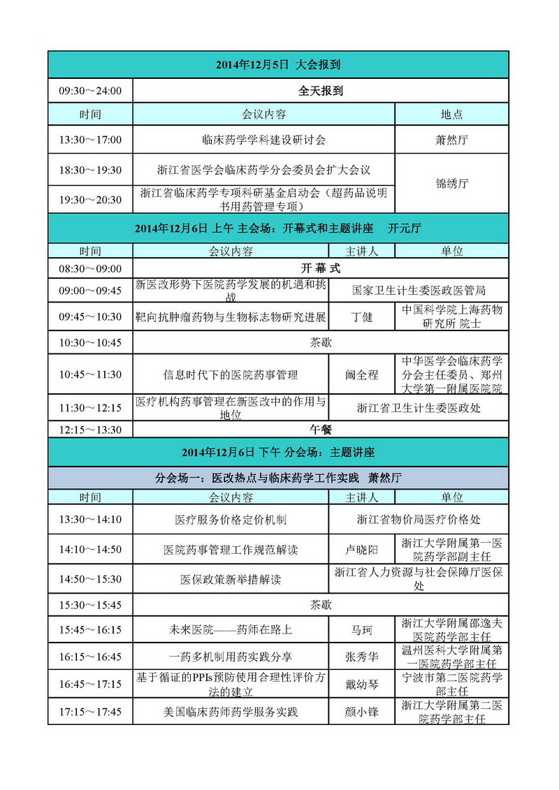 2014年浙江省医学会临床药学学术会议/浙江省中西医结合学会中药专业委员会学术会议议程