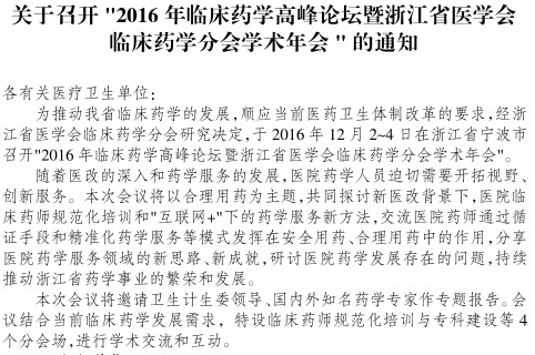 关于召开"2016 年临床药学高峰论坛暨浙江省医学会临床药学分会学术年会" 的通知