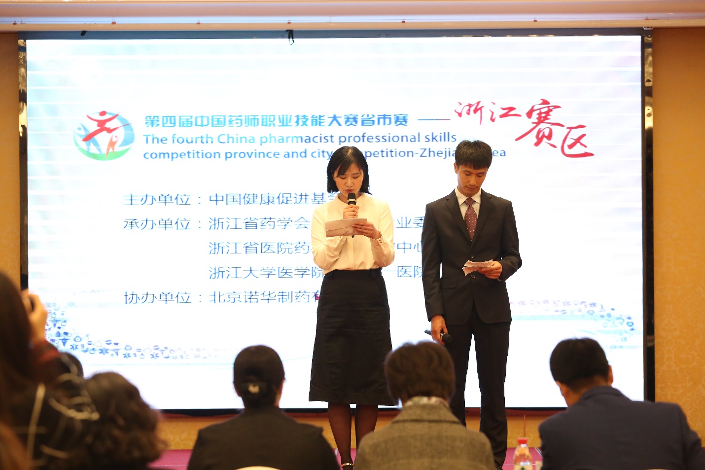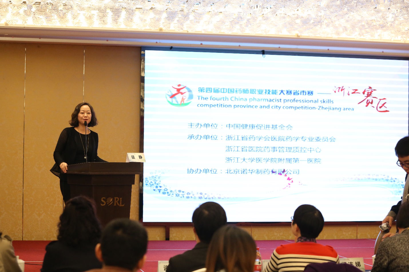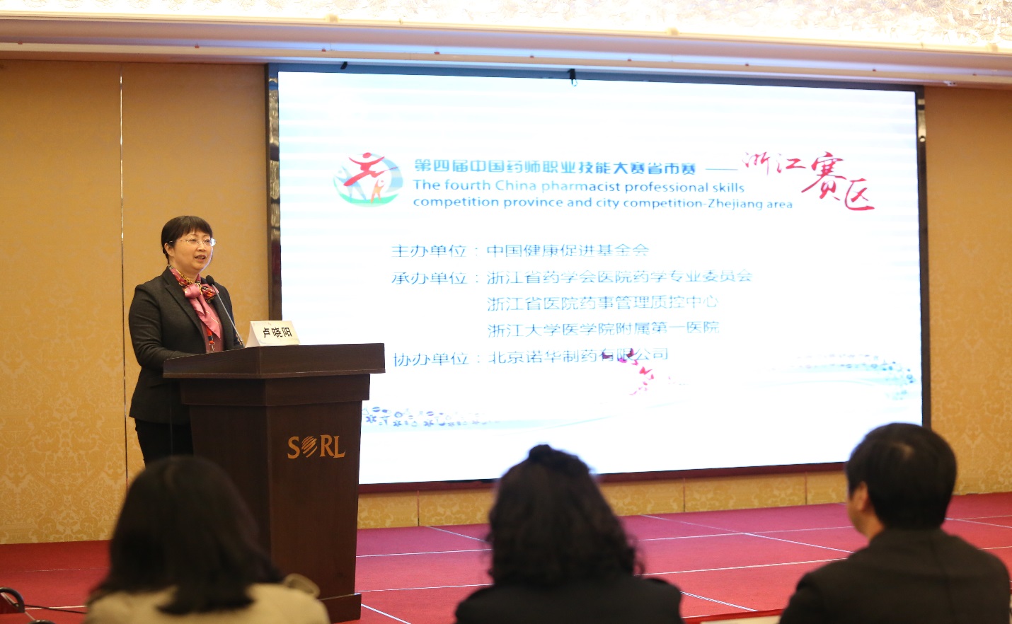 浙江省药学会医院药学专业委员会主任委员、浙江省医院药事管理质控中心常务副主任、浙江大学医学院附属第一医院药学部卢晓阳主任担任浙江省赛主席。卢晓阳主任首先做开幕欢迎致辞,浙江省药学会马珂副秘书长,中国健康促进基金会医药知识管理专项基金管理委员会李旭副秘书长,北京诺华制药有限公司东区大客户部谈静副总监分别代表致辞。浙江大学医学院附属第一医院药学部吕宁和浙江省立同德医院药学部韩冰两位药师共同主持此次比赛。