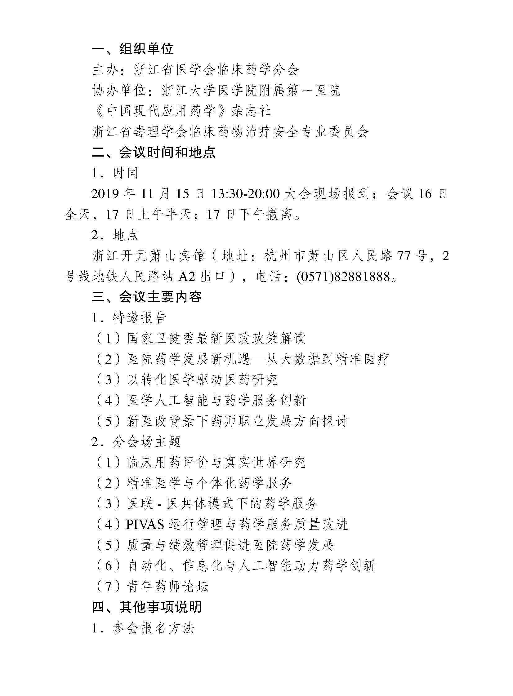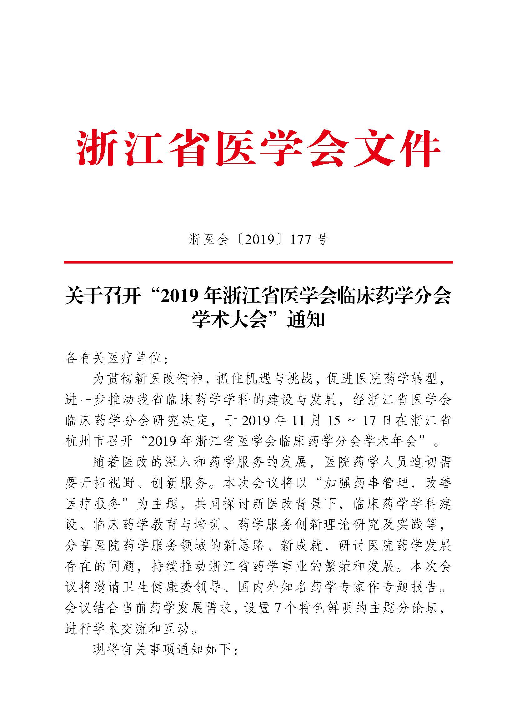 关于召开2019 年浙江省医学会临床药学分会学术大会通知