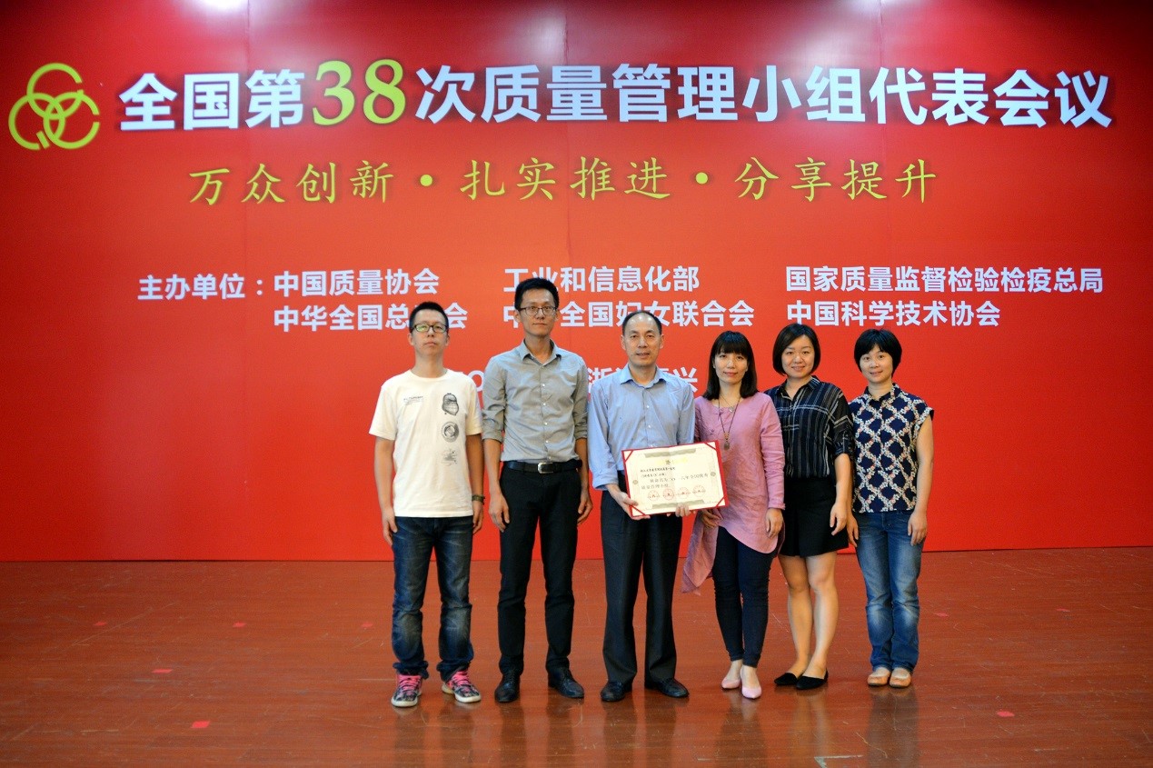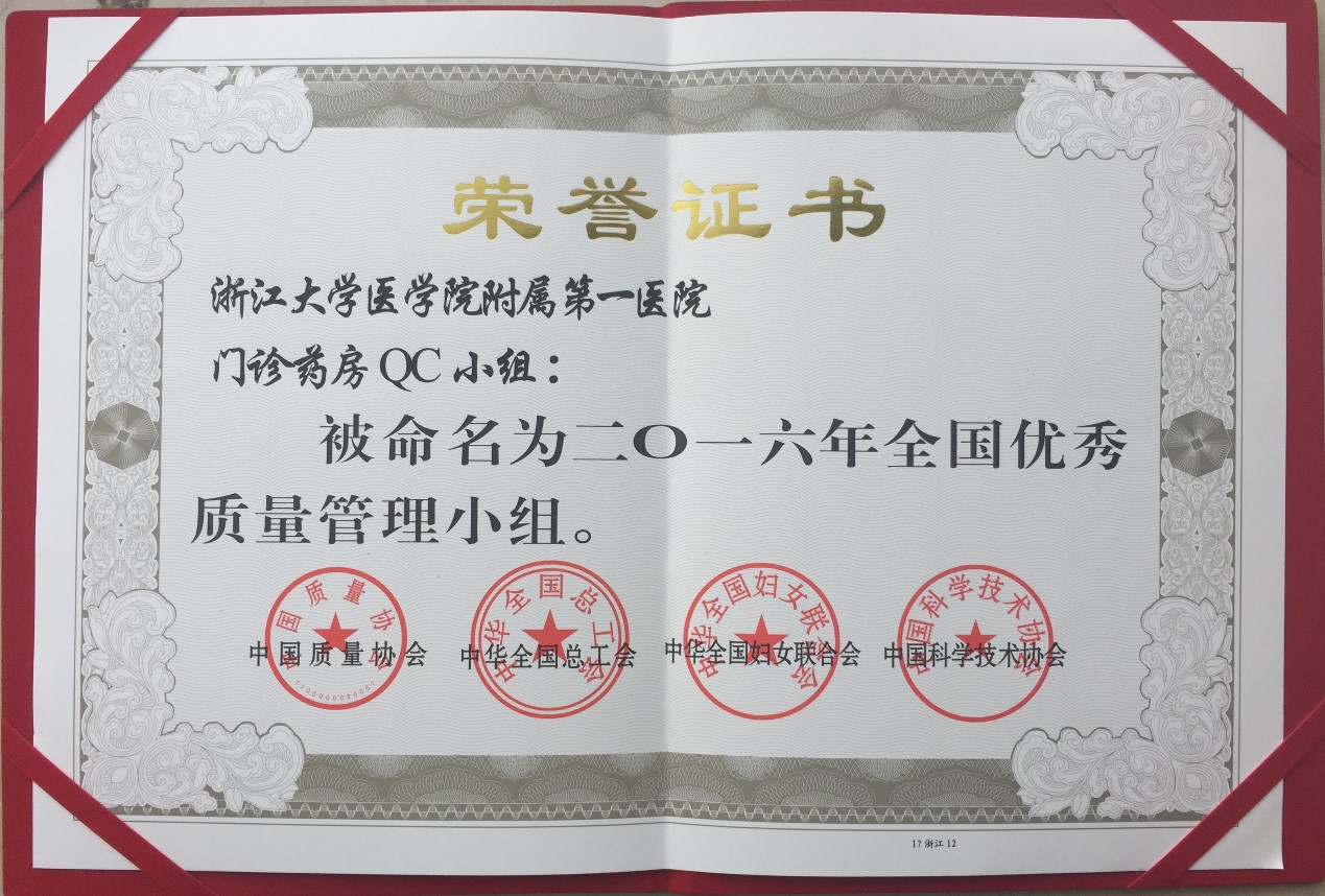 2016年9月,由工信部、国家质检总局指导,中国质量协会、中华全国总工会、中华全国妇联、中国科学持术协会联合举办的全国第三十八次质量管理小组代表会议在浙江省嘉兴市召开。经过大会评比,浙江大学医学院附属第一医院门诊药房QC小组被命名为二〇一六全国优秀质量管理小组并授予荣誉证书!