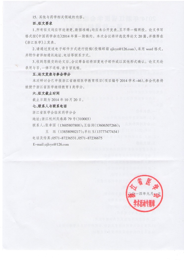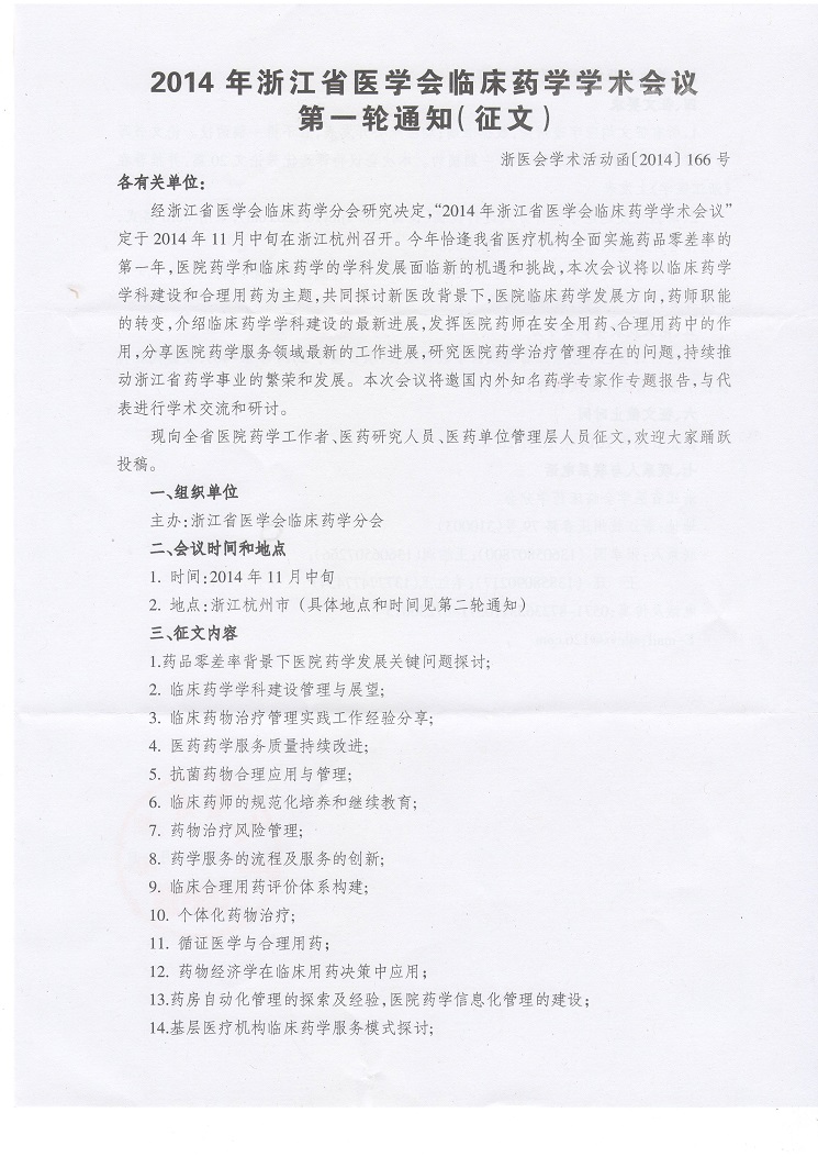 2014年浙江省医学会临床药学学术会议第一轮通知(征文)