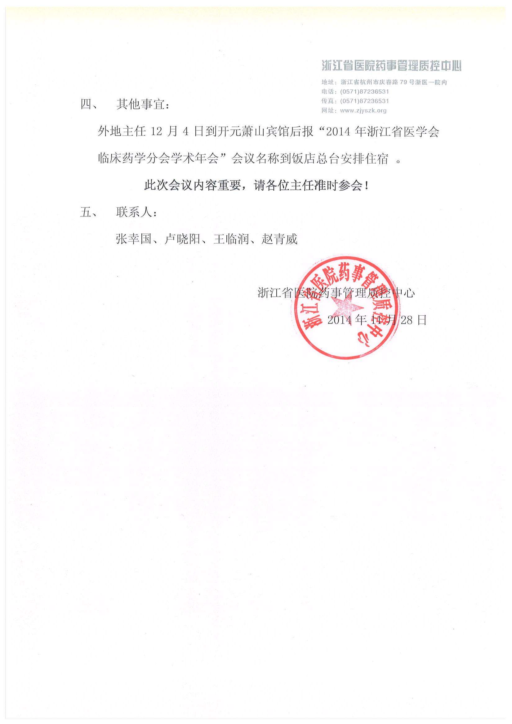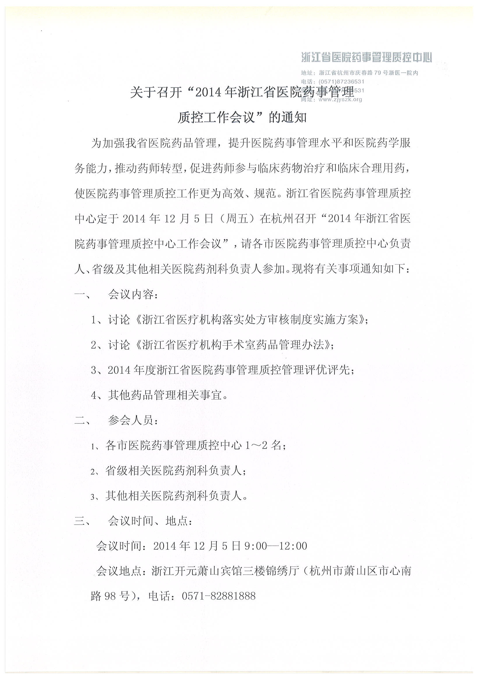 关于召开“2014年浙江省医院药事管理质控中心会议”的通知