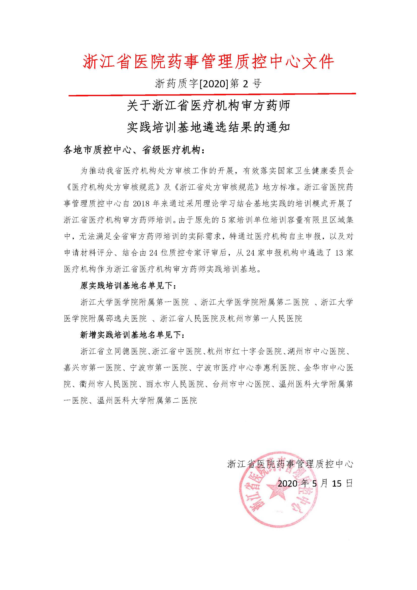 关于浙江省医疗机构审方药师实践培训基地遴选结果的通知