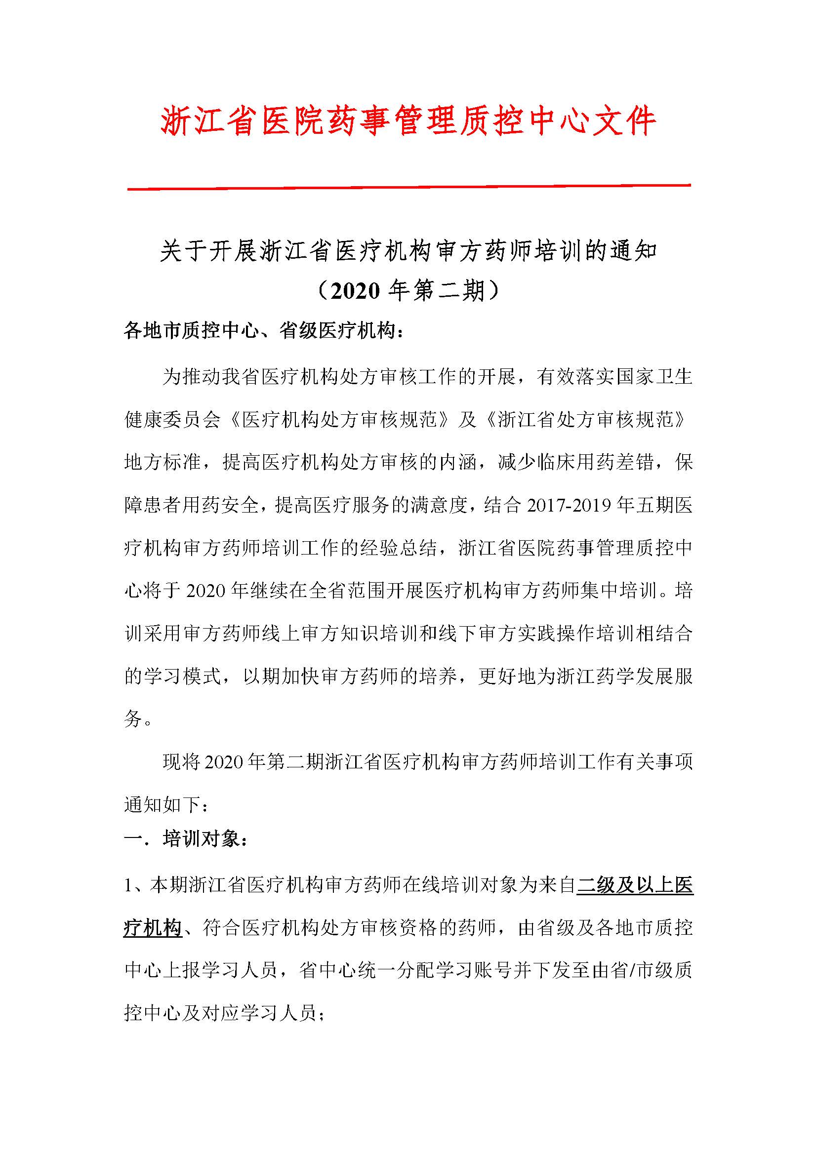 关于开展浙江省医疗机构审方药师培训的通知(2020年第二期)