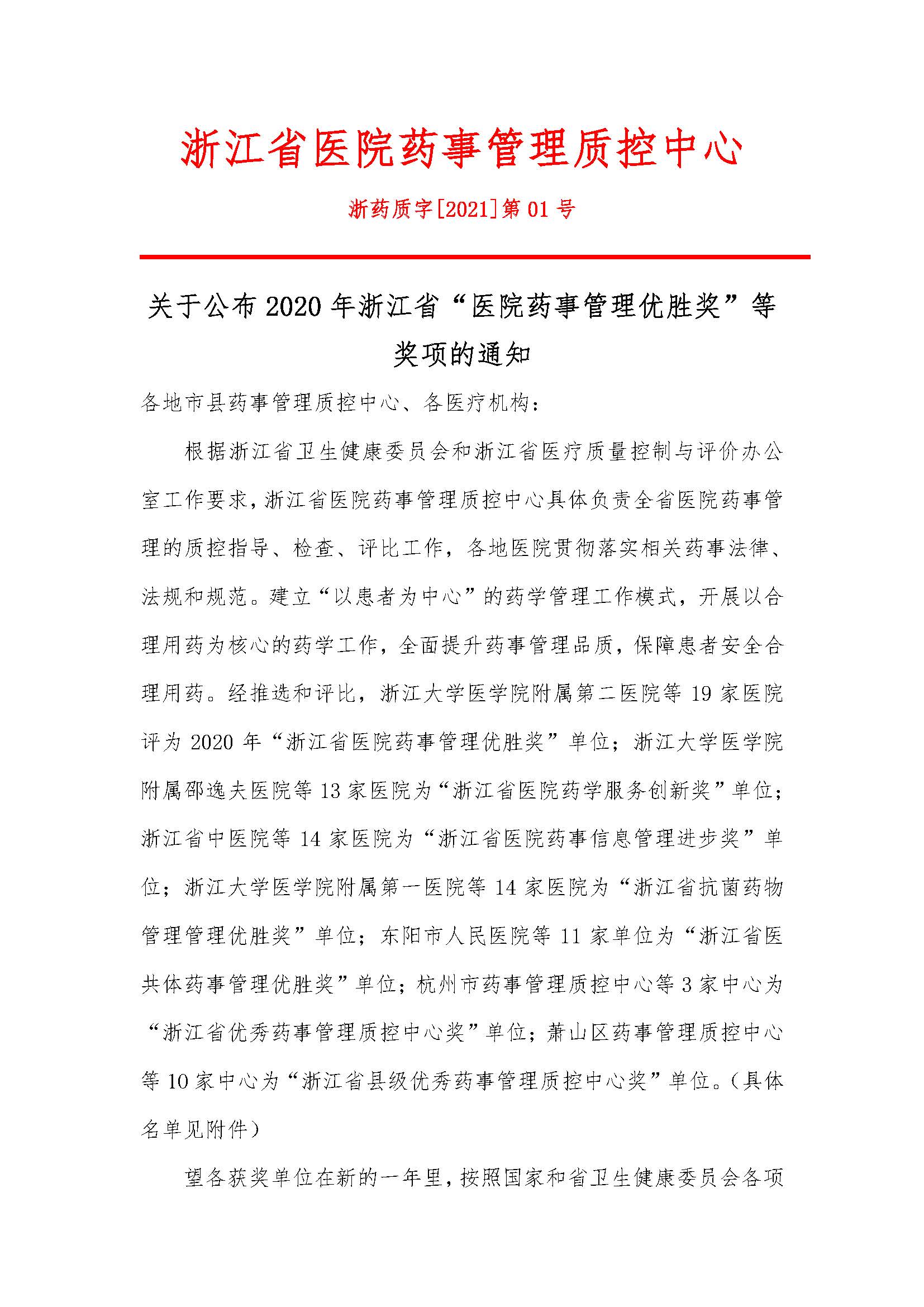 关于公布2020年浙江省“医院药事管理优胜奖”等奖项的通知