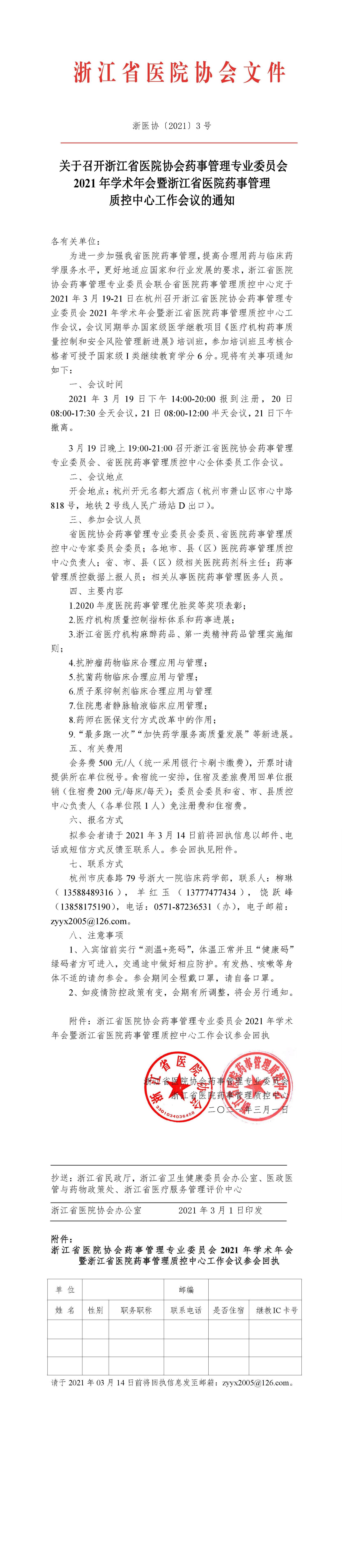 关于召开浙江省医院协会药事管理专业委员会2021年学术年会暨浙江省医院药事管理质控中心工作会议的通知