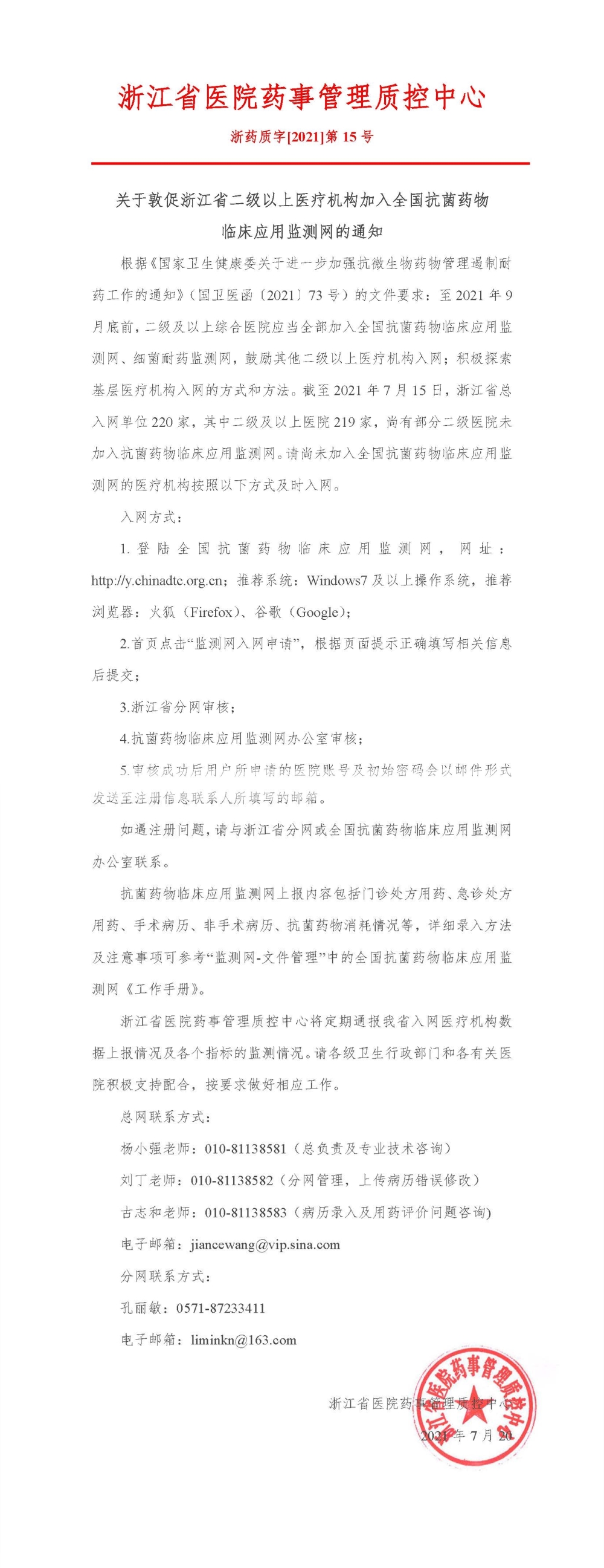 关于敦促浙江省二级以上医疗机构加入全国抗菌药物临床应用监测网的通知