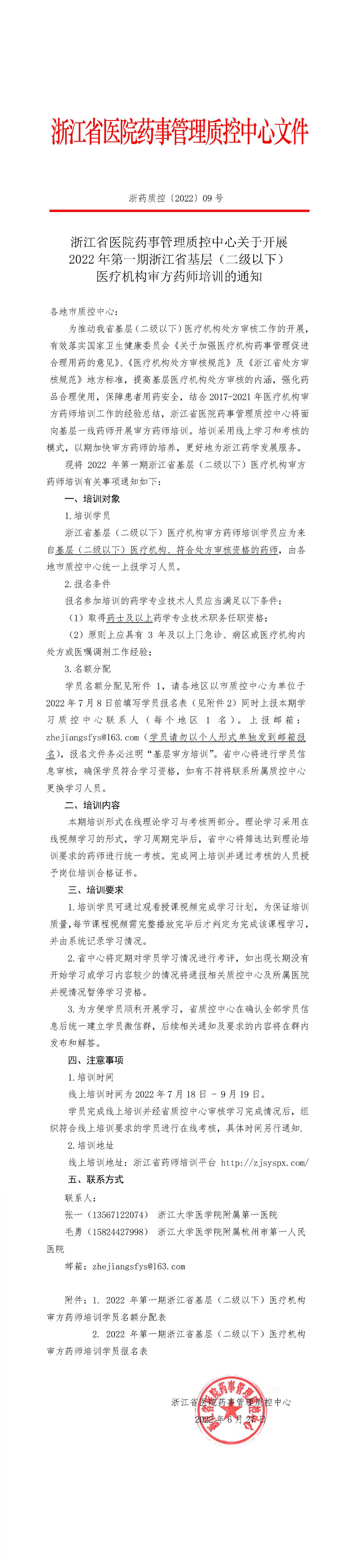 浙江省医院药事管理质控中心关于开展2022年第一期浙江省基层(二级以下)医疗机构审方药师培训的通知