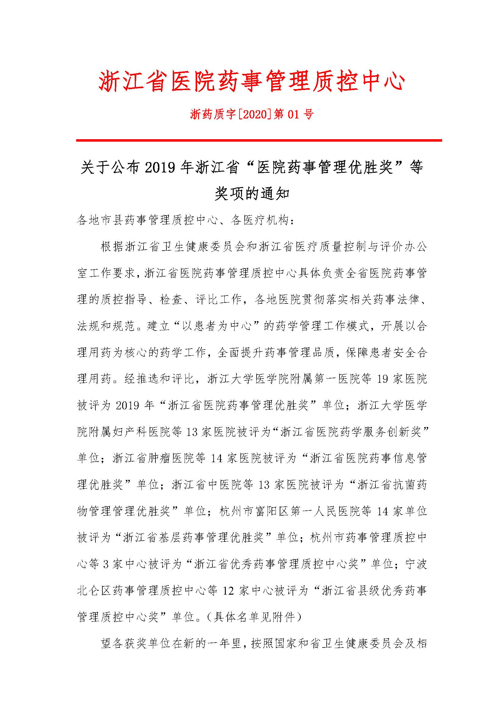 关于公布2019年浙江省“医院药事管理优胜奖”等奖项的通知