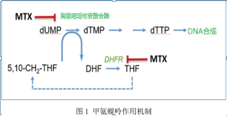 甲氨蝶呤(MTX)是一种抗叶酸药物,通过竞争性抑制二氢叶酸还原酶(DHFR),消耗还原型四氢叶酸(THF)辅助因子,阻碍核苷酸合成,从而阻止DNA、RNA和蛋白质合成所必需的嘌呤和嘧啶的合成。此外,MTX能抑制胸腺嘧啶核苷酸合成酶(TS),从而抑制胸腺嘧啶单磷酸(TMP)的合成和随后的DNA合成。MTX对细胞周期的S期具有特异性,因此增殖活跃的组织更易受其影响[1,2]。