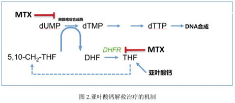 亚叶酸钙(亚叶酸)作为一种解救药物,通过恢复机体叶酸水平,不经过DHFR途径,直接提供四氢叶酸(THF),消耗在细胞中甲氨蝶呤。亚叶酸钙的输注,应在MTX输注24h后进行,避免MTX的抗肿瘤活性降低[1-4]。