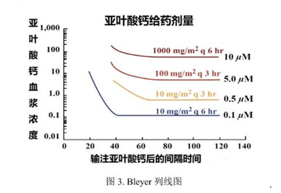 亚叶酸钙的给药剂量应根据MTX的血药浓度和MTX给药时间进行调整[4]。除非治疗方案另有规定,Bleyer列线图常被使用决定剂量。