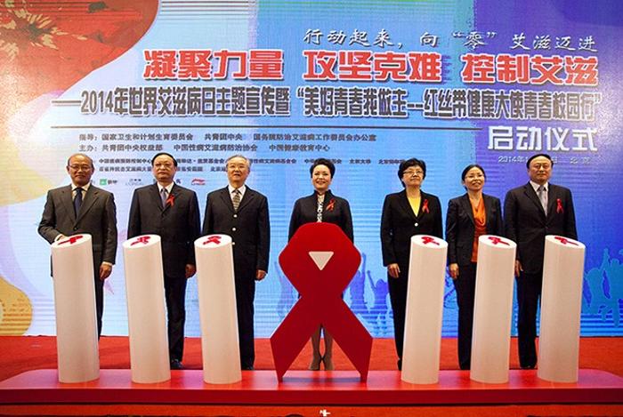 1130日,--红丝带健康大使青春校园行”启动仪式在北京大学举行。国家卫生计生委主任李斌副主任王国强,共青团中央书记处书记汪鸿雁,中国性病艾滋病防治协会会长张文康,北京大学党委书记朱善璐、校长王恩哥等出席活动。活动还特别邀请了世界卫生组织艾滋病防治亲善大使、艾滋病宣传员彭丽媛教授。