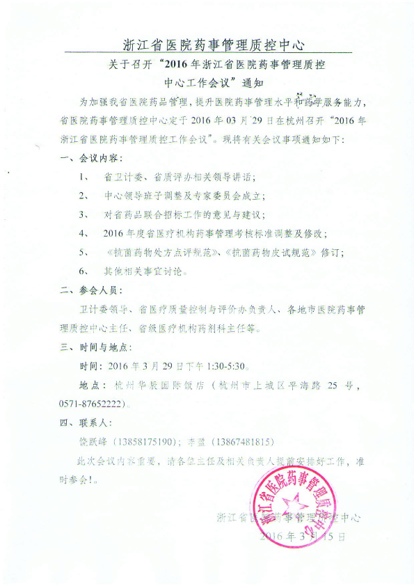 为加强我省医院药品管理,提升医院药事管理水平和药学服务能力,省医院药事管理质控中心定于2016年03月29日在杭州召开“2016年浙江省医院药事管理质控工作会议”。现将有关会议事项通知如下: