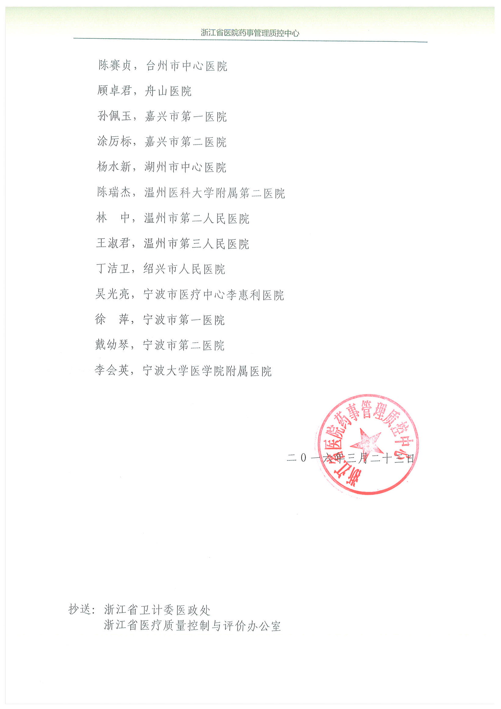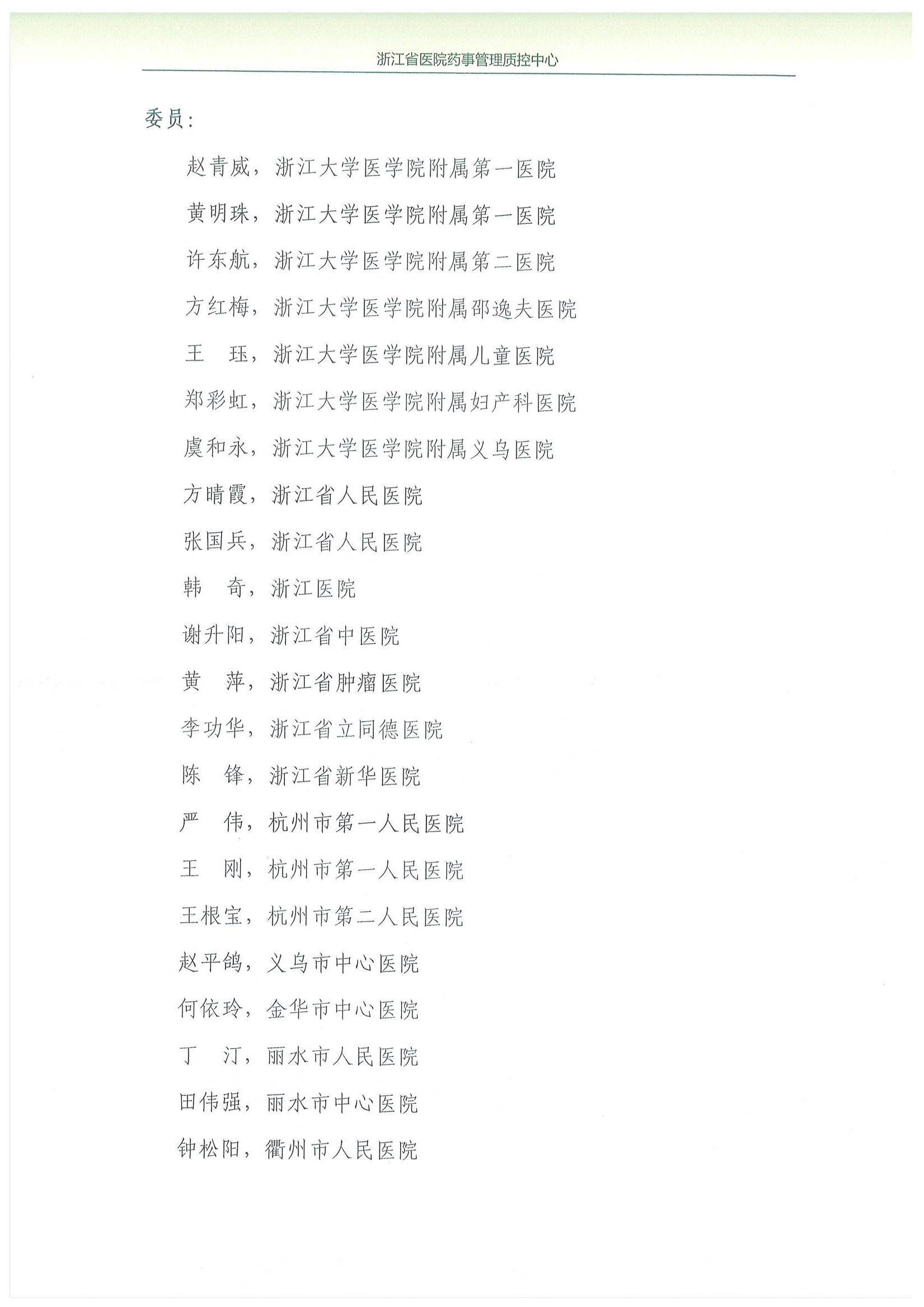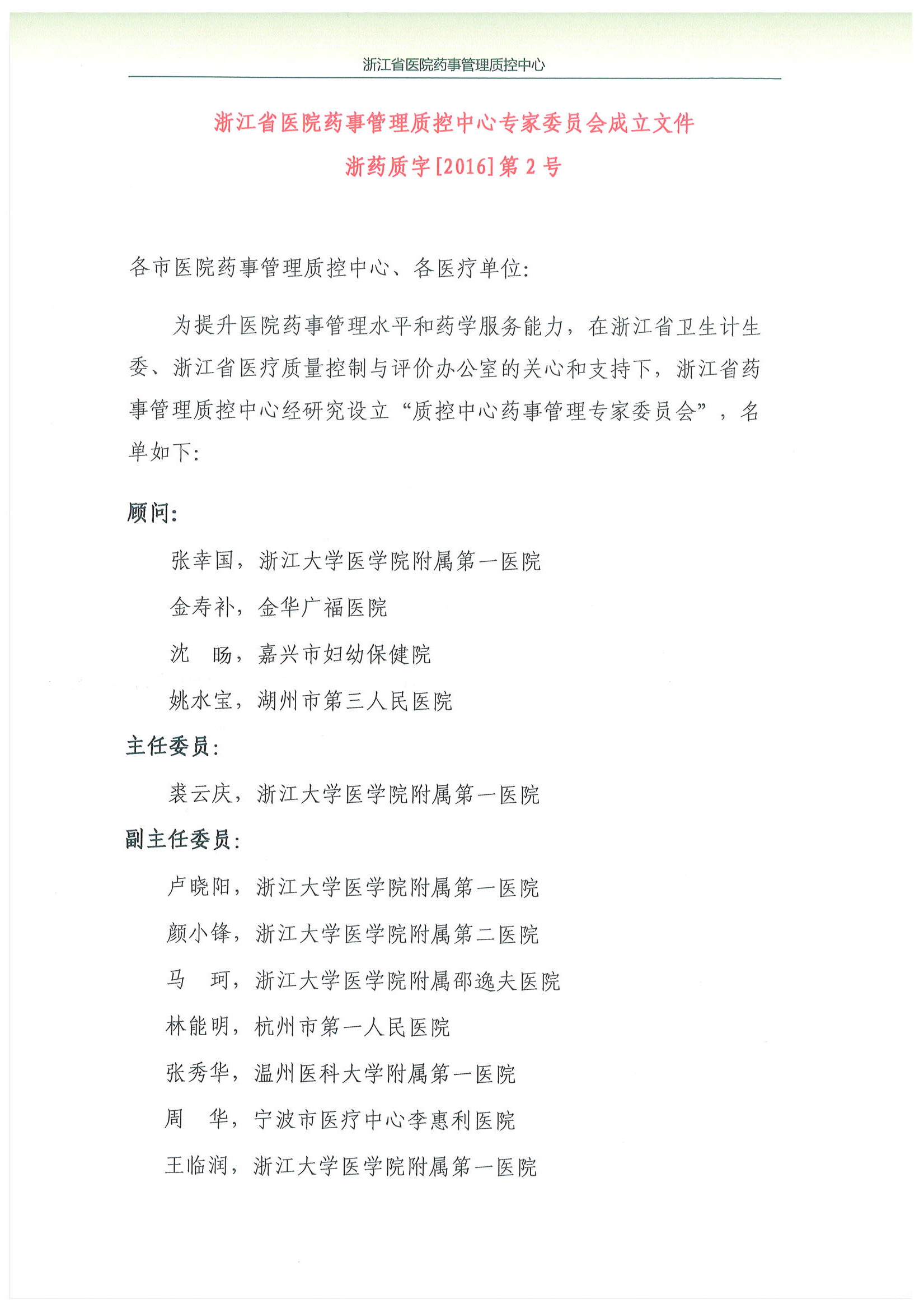 浙江省医院药事管理质控中心专家委员会成立文件2