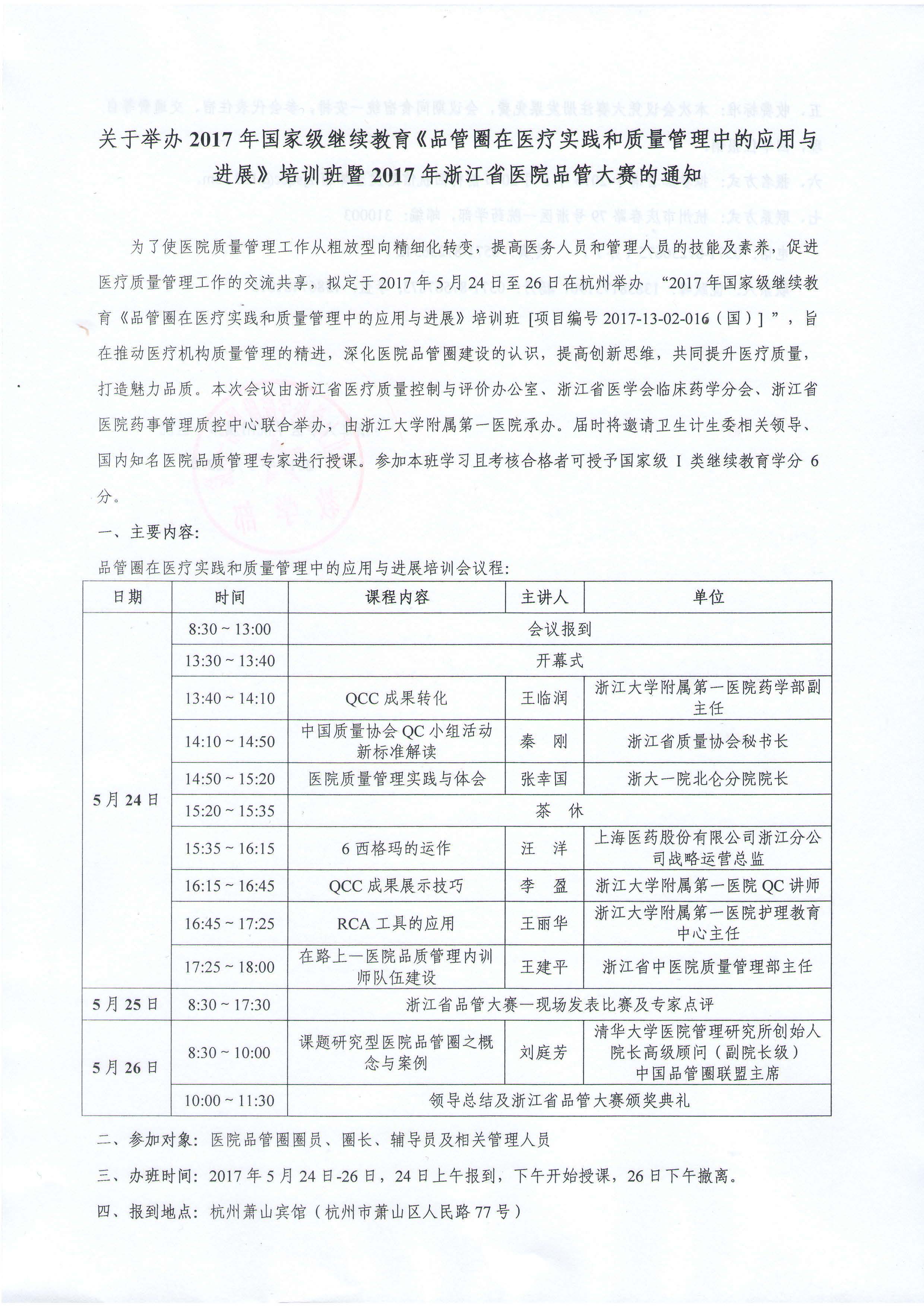 关于举办2017年国家级继续教育《品管圈在医疗实践和质量管理中的应用与 进展》培训班暨2017年浙江省医院品管大赛的通知