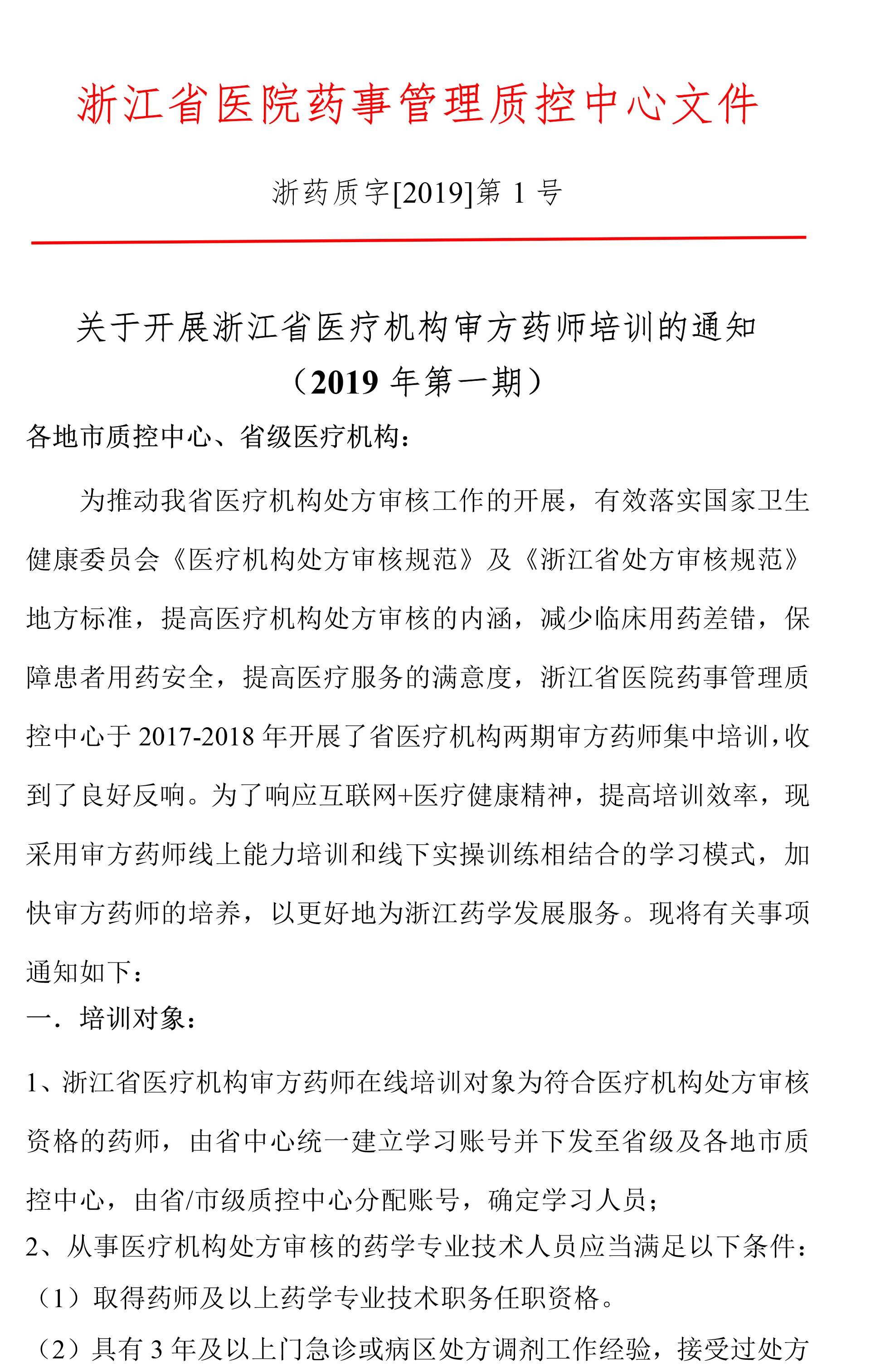 关于开展浙江省医疗机构审方药师培训的通知 (2019 年第一期)