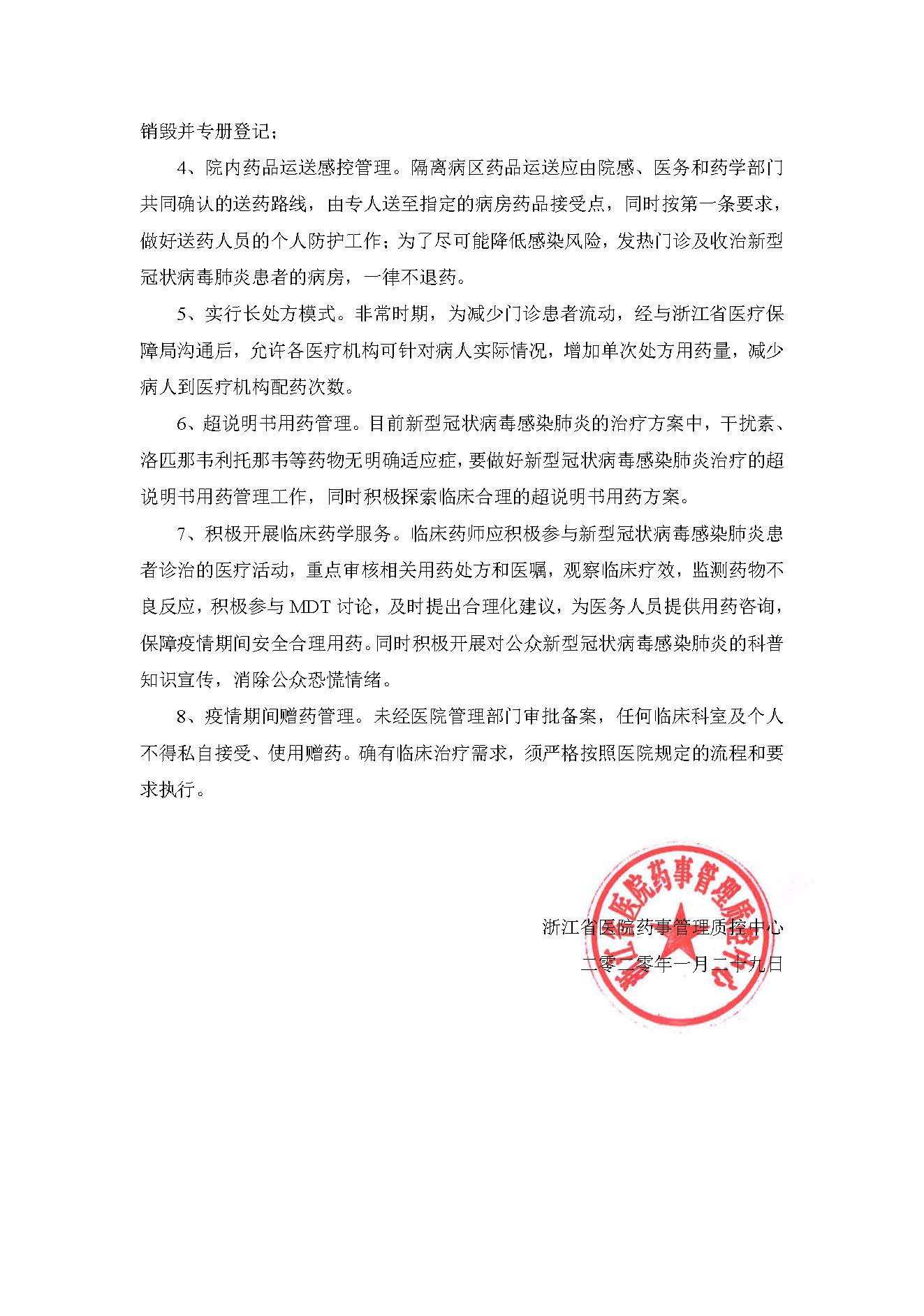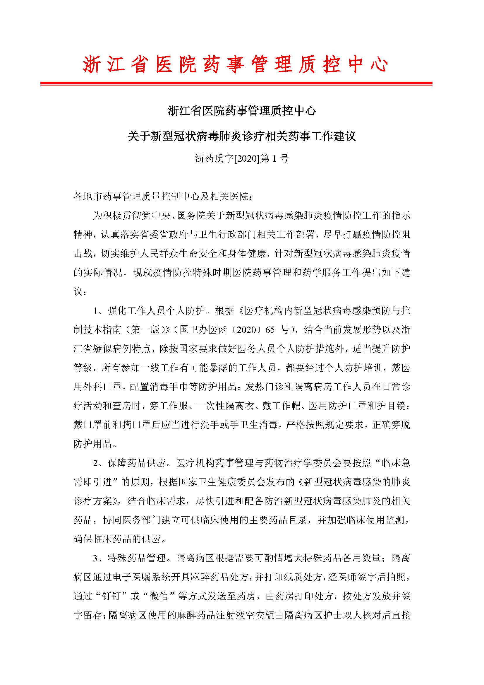 浙江省医院药事管理质控中心关于新型冠状病毒肺炎诊疗相关药事工作建议 浙药质字[2020]第1号