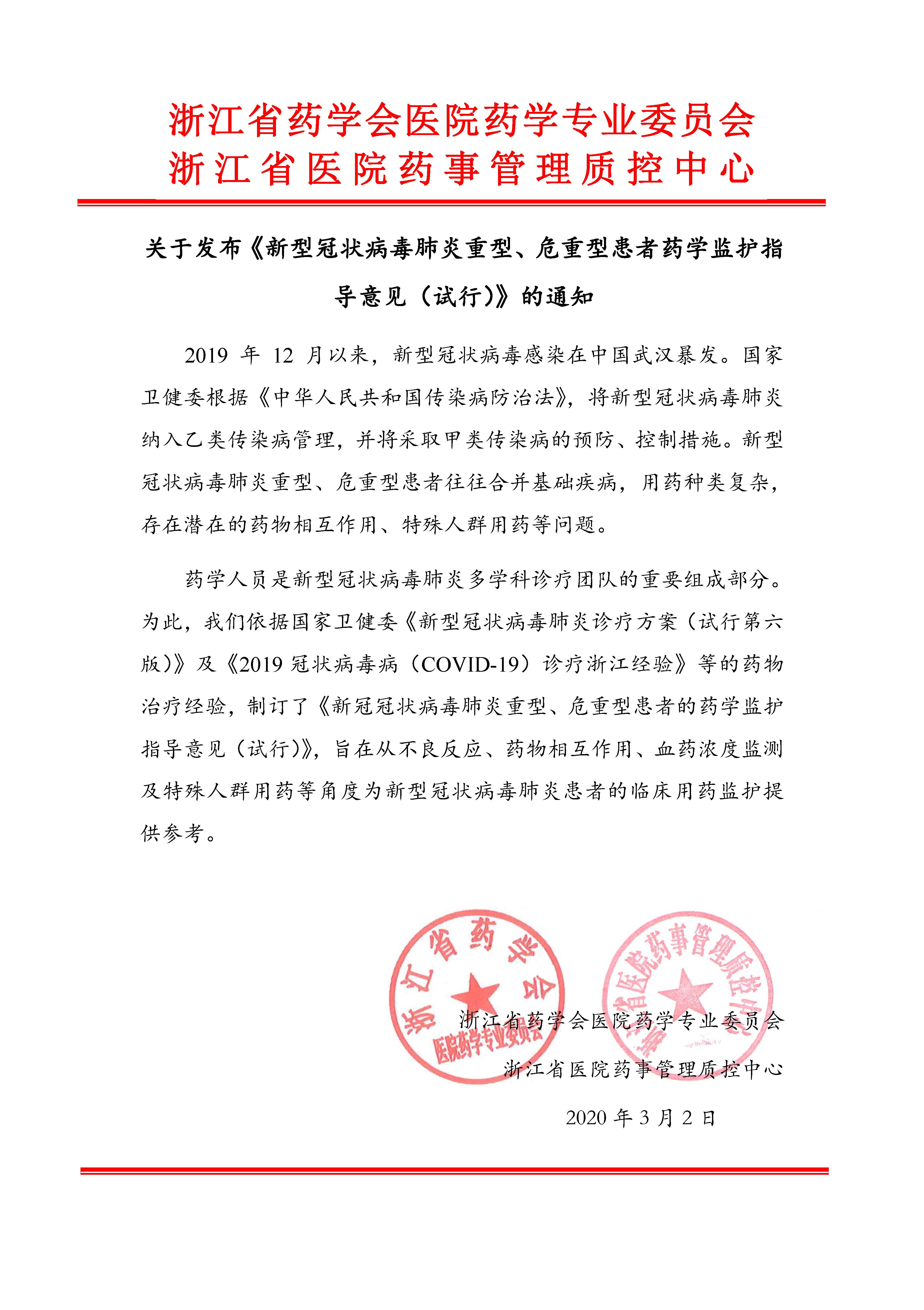 关于发布《新型冠状病毒肺炎重症、危重型患者药学监护指导意见(试行)》的通知
