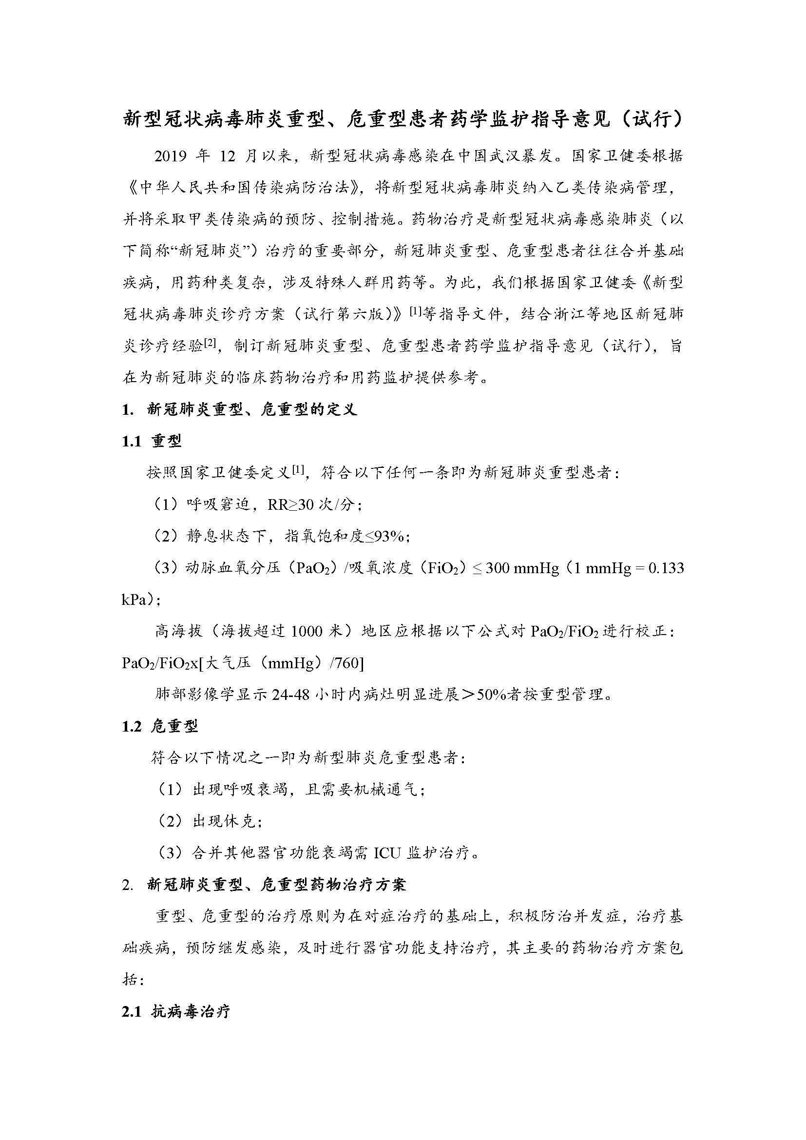 关于发布《新型冠状病毒肺炎重症、危重症患者药学监护指导意见(试行)》的通知