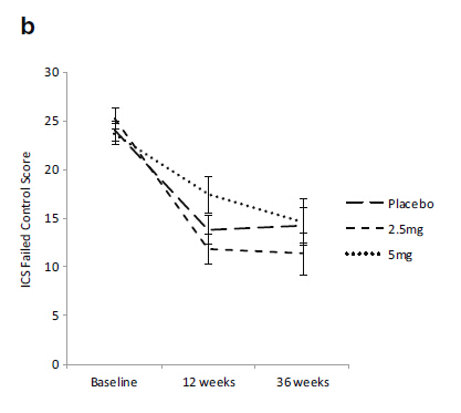 ◆治疗后6个月,2.5 mg组参与者比安慰剂组的饮酒天数更少,对酒精的控制力更强。2.5 mg组与5 mg组之间的PDD与酒精使用控制力受损-控制失败(ICS-Failed Control)差异无统计学意义,但方法趋势表明2.5 mg组比5 mg组的治疗应答更好。