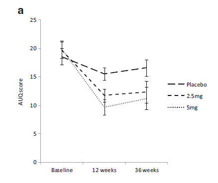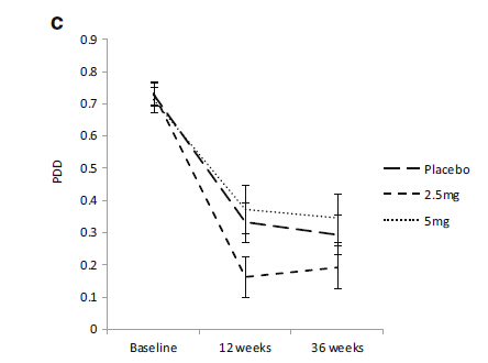 ◆与安慰剂组相比,2.5 mg治疗组的PDD较低,且酒精控制力提高最明显;有趣的是5 mg组与安慰剂治疗的效果无差别。