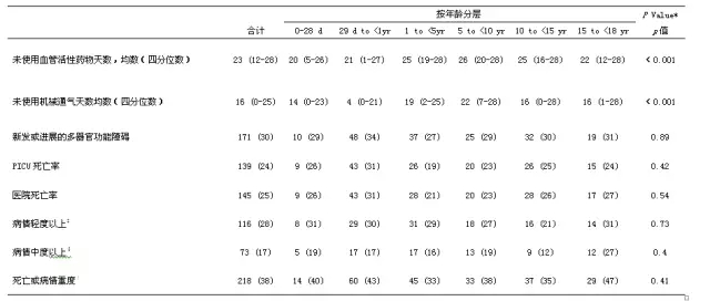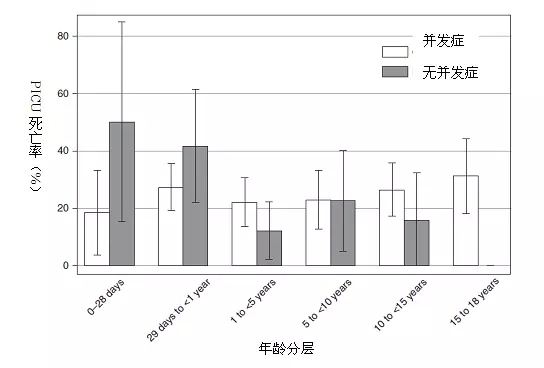 条柱表示PICU死亡率,误差线表示95%可信区间。根据年龄及并发症分组,各组间死亡率差别没有统计学意义,P值分别为0.42和0.35。