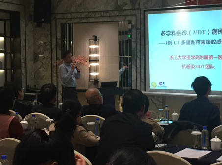 会议由宁波市药学会医院药学专业委员会主任委员周华主任主持,周主任代表市药学会欢迎大家利用课余时间来参加本次研讨会,特别是宁波各大医院临床科室及细菌学专家及主任们。根据会议议程,在专题讲座环节中,由浙江大学医学院附属第一医院药剂科临床药师姜赛平副主任药师和浙江大学医学院附属第一医院检验科杨青副主任检验师分别作了《运用PK/PD理论指导临床用药》、《基于临床的细菌药敏报告解读》的专题报告。在临床MDT模式分享环节中,由浙江大学医学院附属第一医院重症医学科陈俭副主任医师主讲,浙江大学医学院附属第一医院呼吸内科周华副主任医师、浙江大学医学院附属第一医院检验科杨青副主任检验师、浙江大学医学院附属第一医院药剂科临床药师姜赛平副主任药师共同参与,按照临床MDT模式分享了《多学科会诊(MDT)病例分享—1例ICU多重耐药菌腹腔感染案例》,各位专家从自己的专业角度出发分析了该患者抗感染的策略、前期抗感染方案失败的原因及病情变化后抗感染方案的调整。由宁波市第一医院ICU朱建华主任主持的现场讨论环节,临床医生及药师结合临床MDT模式及现场演示案例就自身专业的关注点进行了交流和互动。会议结束前,周华主任作了大会总结,周主任希望药师能通过MDT团队拿起药学的工具多为临床医生提供药学服务,临床医生能给临床药师更多的机会参与临床MDT治疗团队,发挥临床药师的作用,培养临床药师的临床思维和业务技能,促进临床药师健康成长。