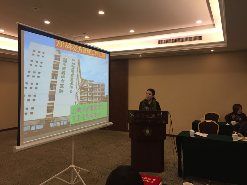 接下来杭州市药事管理质控中心常务副主任、杭州市第一人民医院药学部严伟主任汇报了《杭州市药事管理质控中心2016年工作总结及2017年规划》;荣获省质控“优秀市药事质控中心”的临安市药事管理质控中心戚静燕主任分享了工作经验;荣获市质控“医院处方管理优秀奖”的上城区南星街道社区卫生服务中心袁乐萍副院长介绍了社区药事管理的经验。接下来金伟处长和林能明副院长分别为获得省、市质控中心奖项的18家单位颁奖。