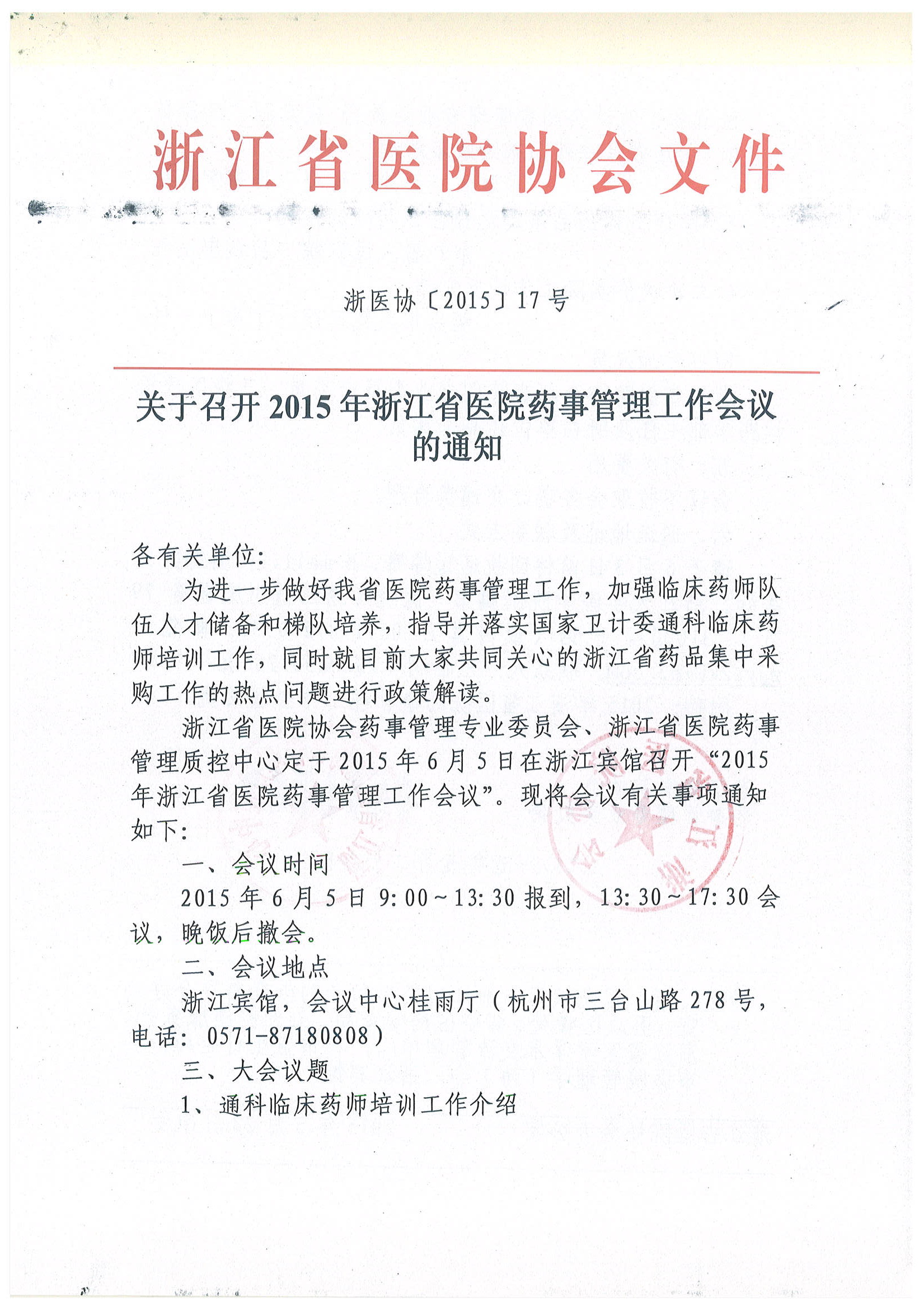 关于召开2015年浙江省医院药事管理工作会议的通知
