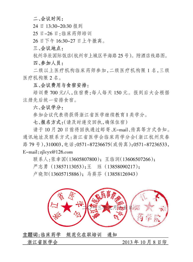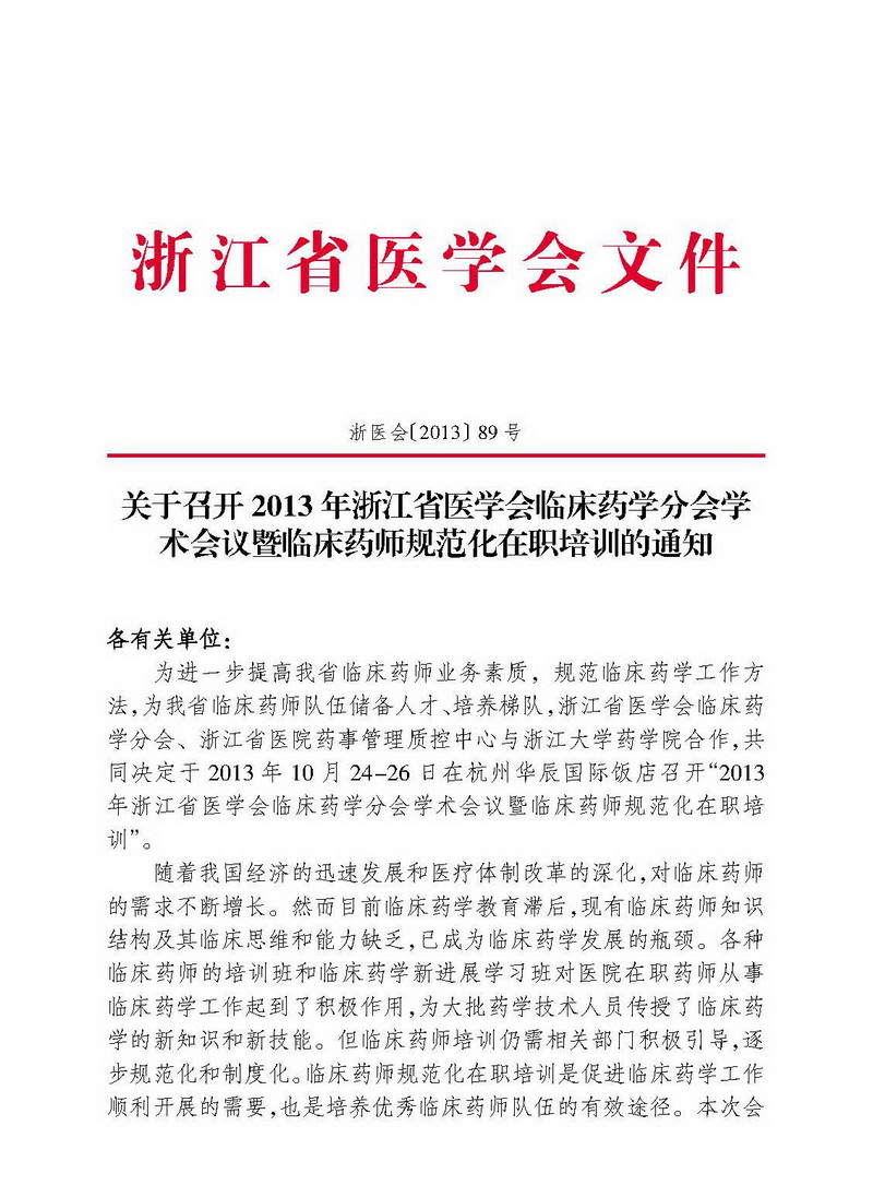 为进一步提高我省临床药师业务素质,规范临床药学工作方法,为我省临床药师队伍储备人才、培养梯队,浙江省医学会临床药学分会、浙江省医院药事管理质控中心与浙江大学药学院合作,共同决定于2013年10月24-26日在杭州华辰国际饭店召开“2013年浙江省医学会临床药学分会学术会议暨临床药师规范化在职培训”。