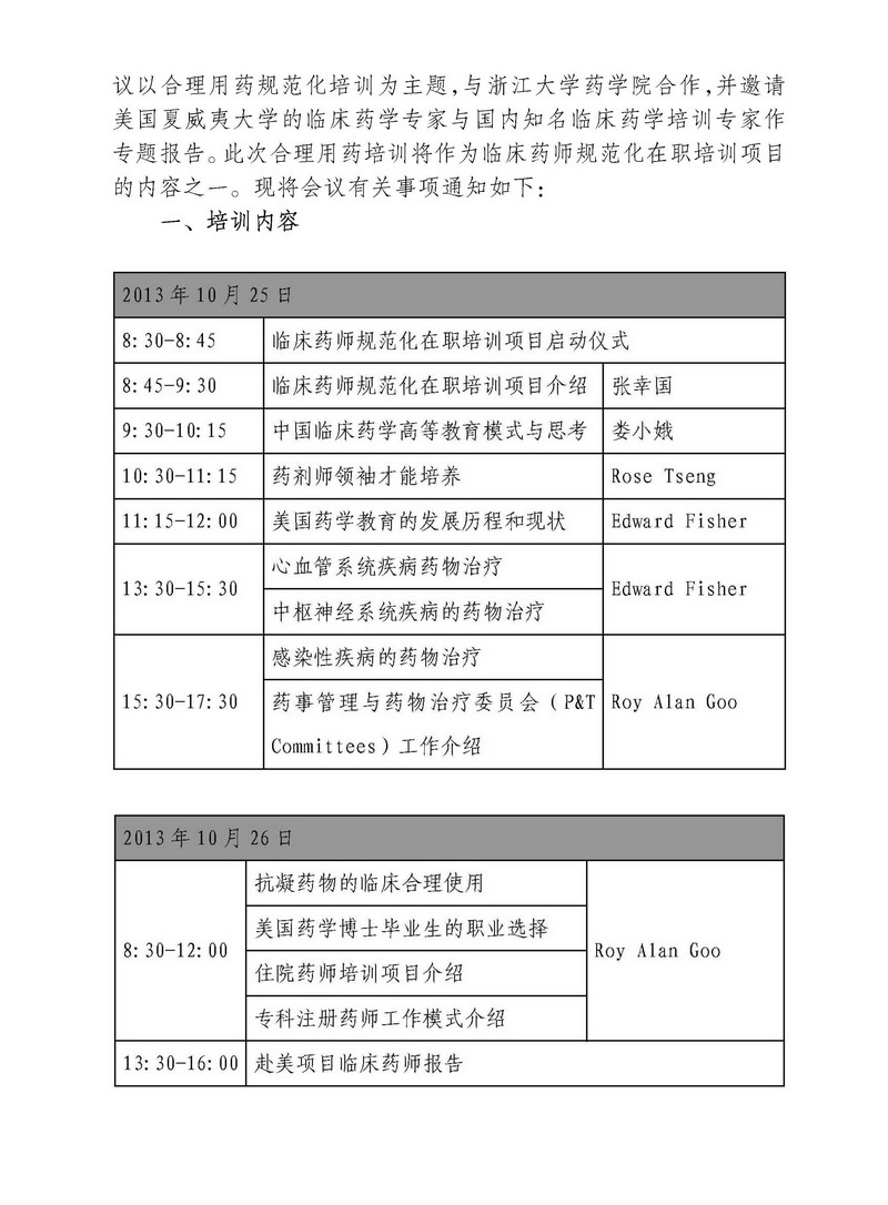 随着我国经济的迅速发展和医疗体制改革的深化,对临床药师的需求不断增长。然而目前临床药学教育滞后,现有临床药师知识结构及其临床思维和能力缺乏,已成为临床药学发展的瓶颈。各种临床药师的培训班和临床药学新进展学习班对医院在职药师从事临床药学工作起到了积极作用,为大批药学技术人员传授了临床药学的新知识和新技能。但临床药师培训仍需相关部门积极引导,逐步规范化和制度化。临床药师规范化在职培训是促进临床药学工作顺利开展的需要,也是培养优秀临床药师队伍的有效途径。本次会议以合理用药规范化培训为主题,与浙江大学药学院合作,并邀请美国夏威夷大学的临床药学专家与国内知名临床药学培训专家作专题报告。此次合理用药培训将作为临床药师规范化在职培训项目的内容之一。现将会议有关事项通知如下: