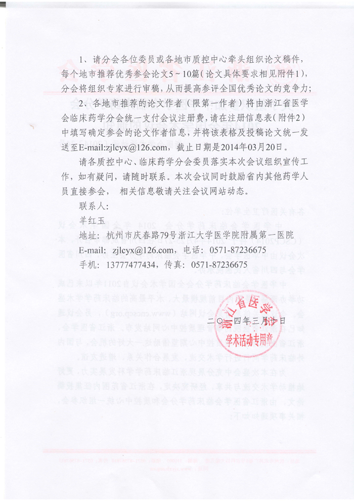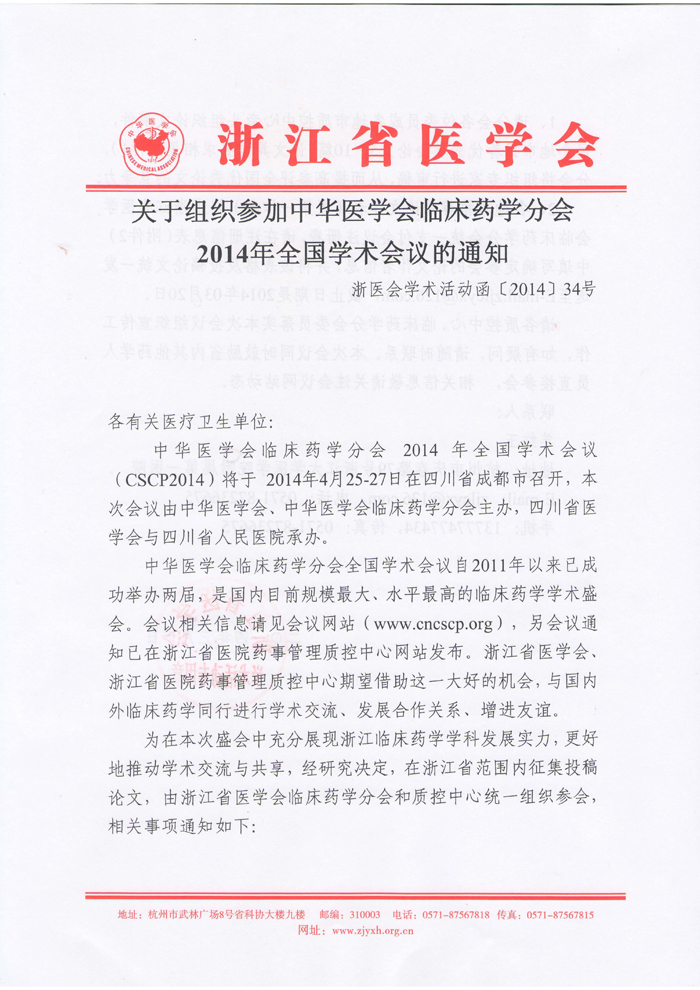 关于组织参加中华医学会临床药学分会2014年全国学术会议的通知